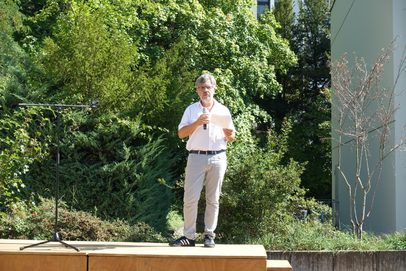 Als erstes betrat Herr Behrens die Bühne und hielt eine Begrüßungsrede. Er wünschte uns allen ein erfolgreiches neues Schuljahr und begrüßte die neuen Fünftklässler*innen.
