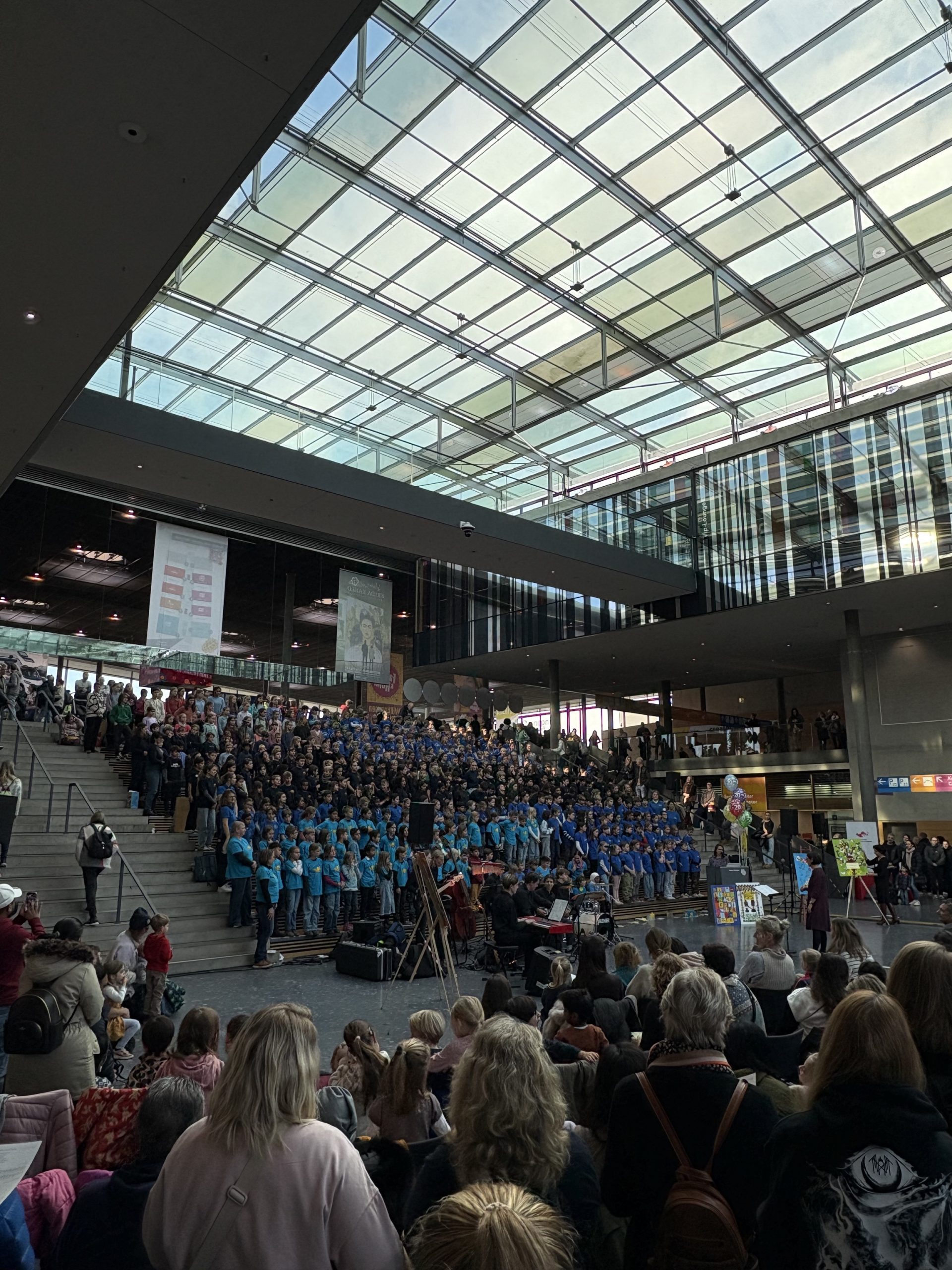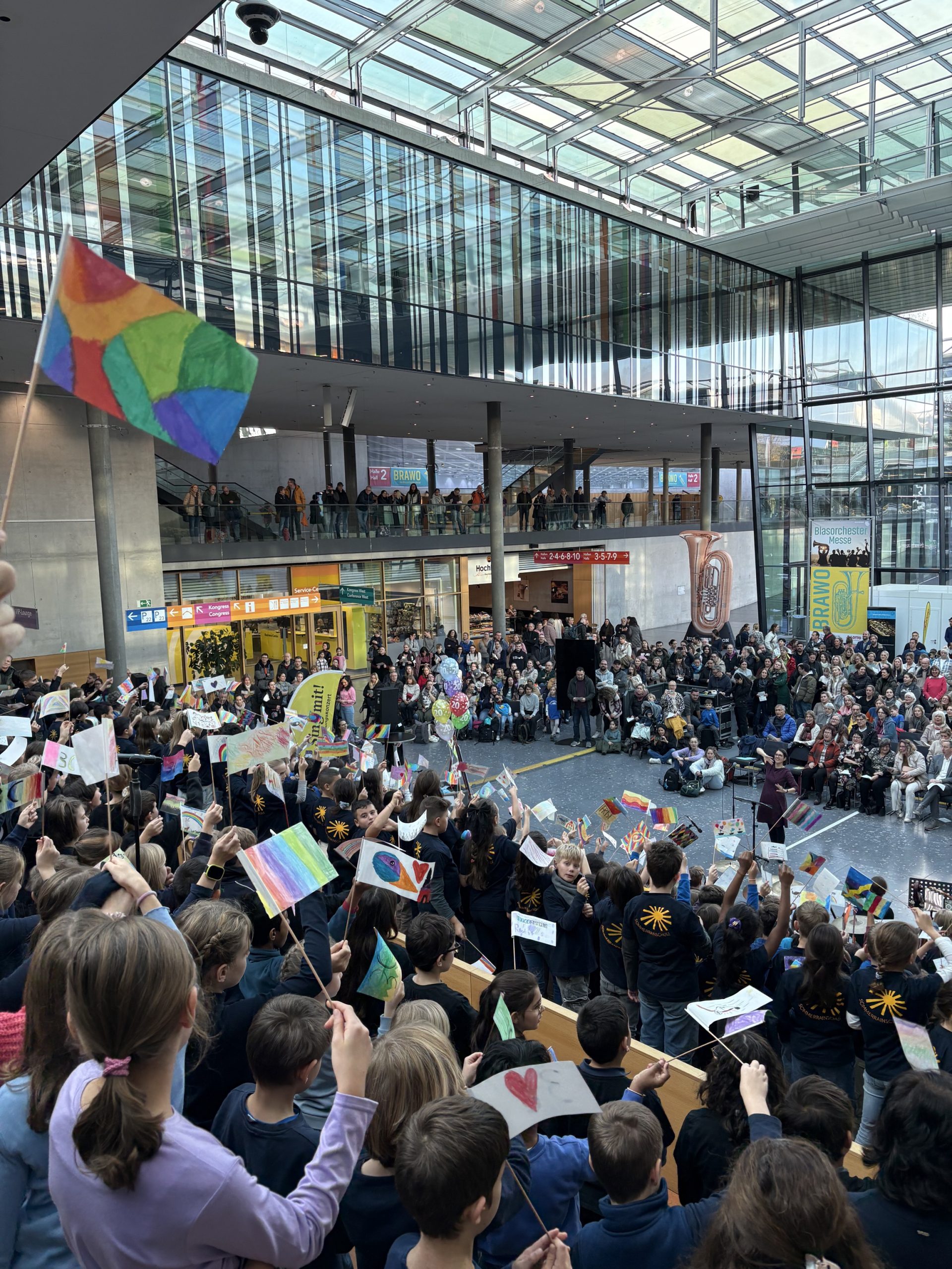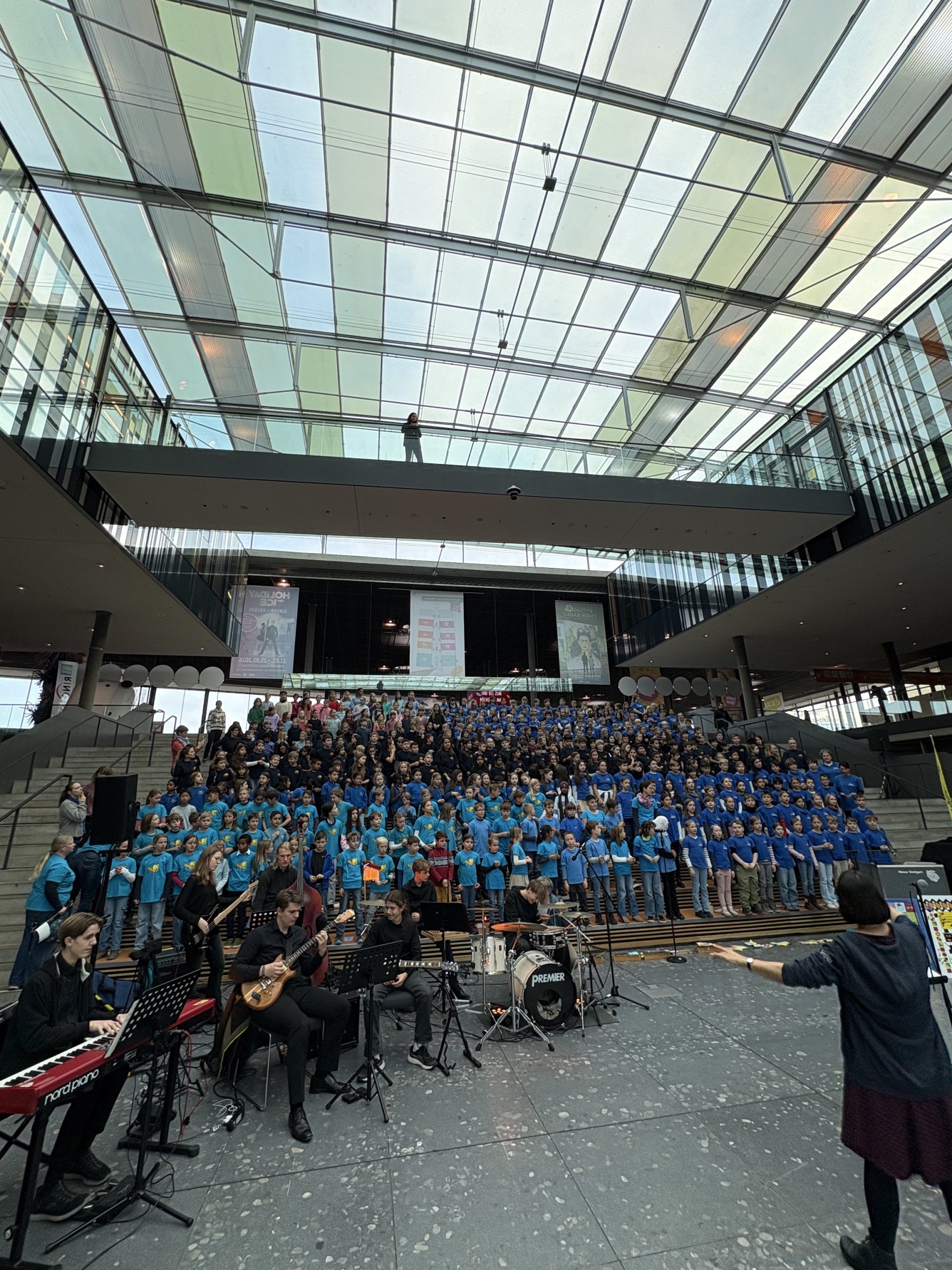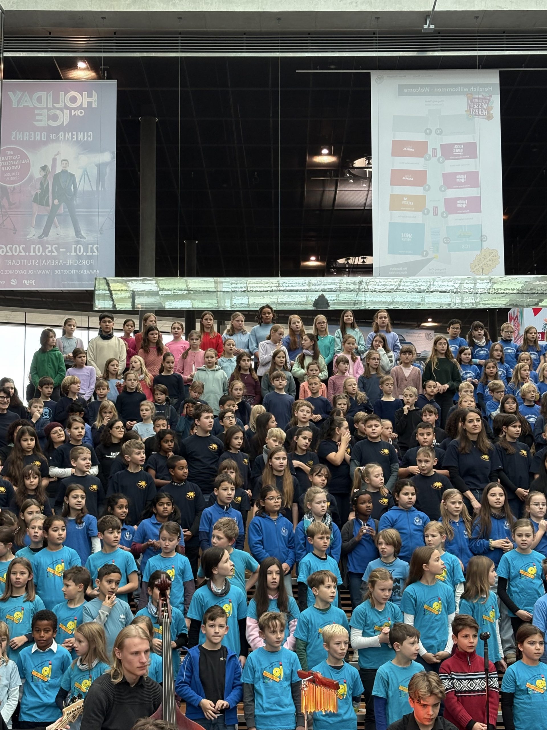 Der Chor trat sowohl alleine als auch als Teil des großen Jubiläumschores mit insgesamt 420 Schülerinnen und Schülern verschiedener Schulen im Atrium der Messe Stuttgart auf und hatte im Anschluss sogar noch die Gelegenheit, gratis die Spiele- und Kreativmesse zu besuchen.