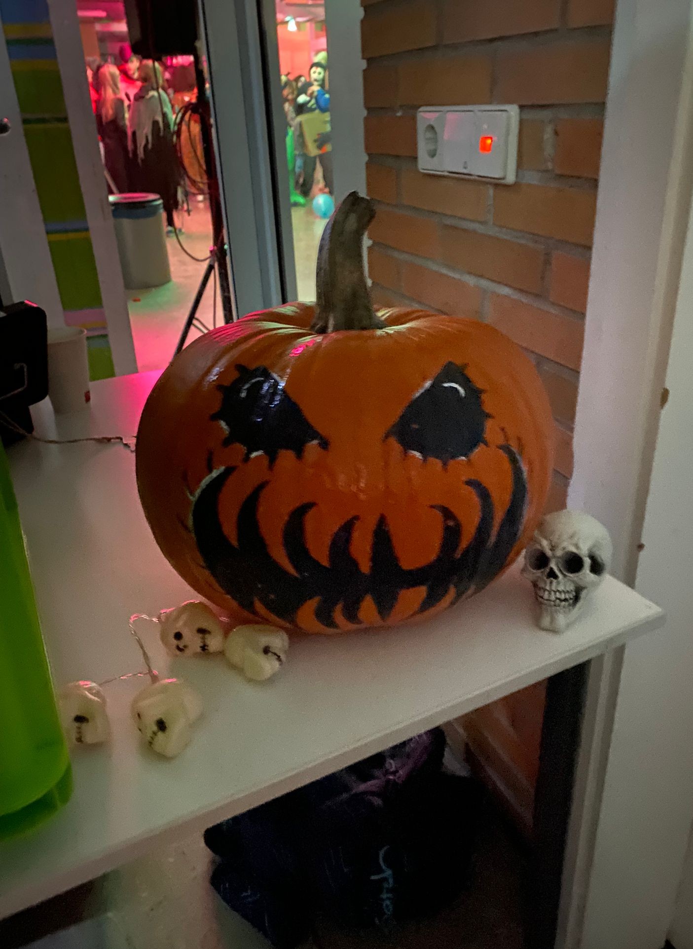 Die Deko war dieses Jahr besonders spooky und mit viel Liebe zum Detail! Von unzähligen Luftballons über cool bemalte Kürbisse bis hin zu gruseligen Skeletten war alles dabei.