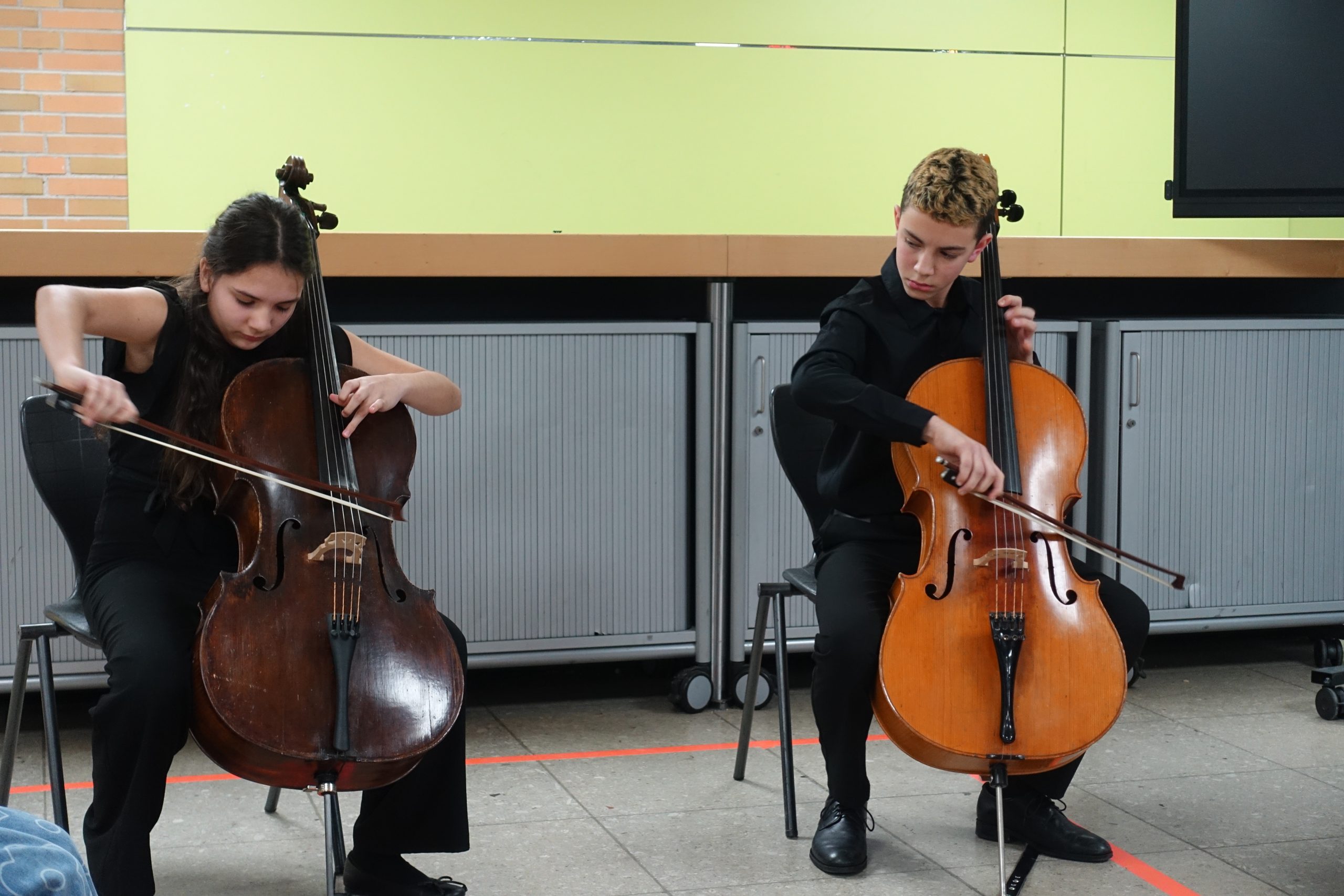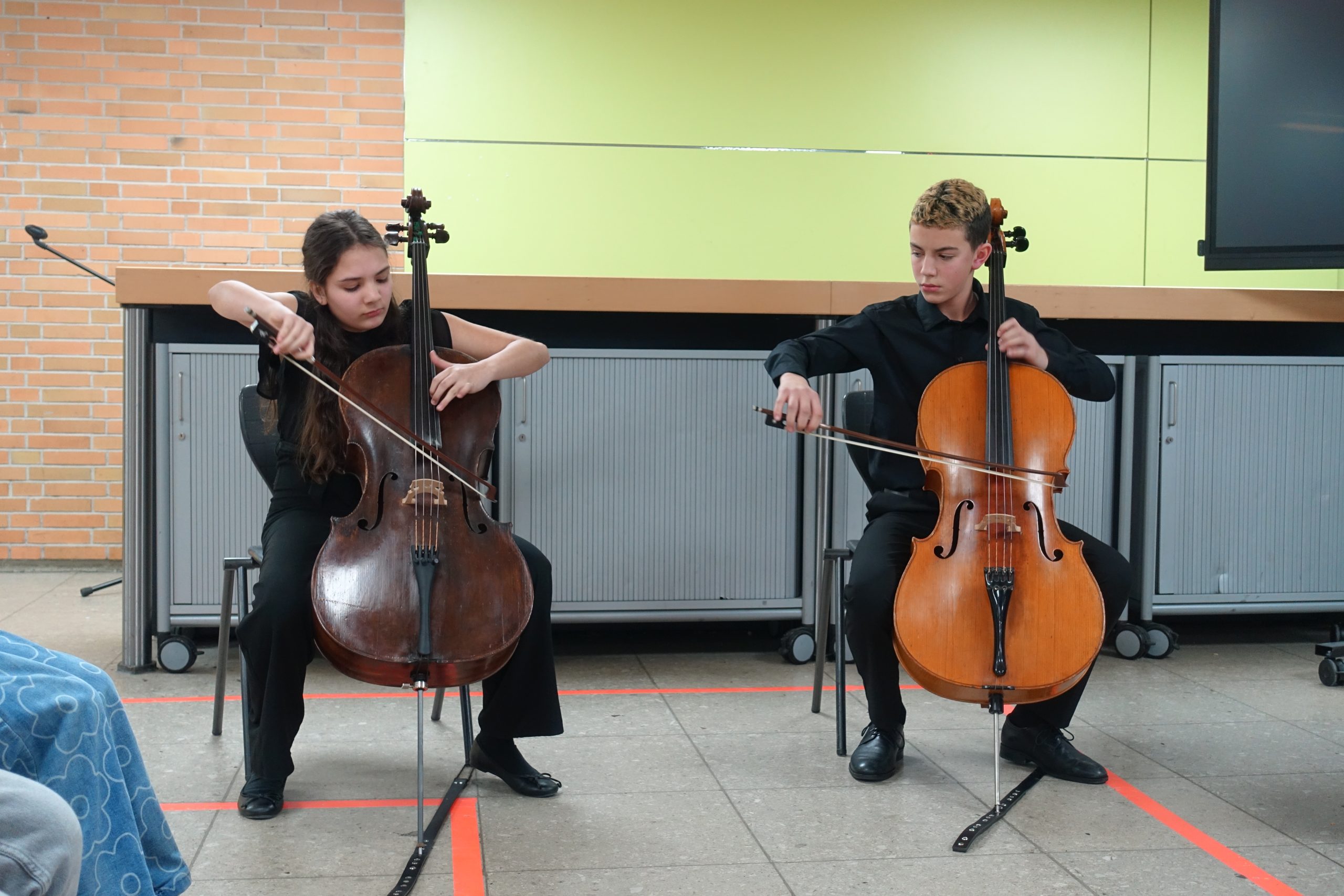 Auf die Verkündung der Gewinnerinnen und des Gewinners des Kunst-Wettbewerbs folgte eine sagenhafte Darbietung der beiden Gewinner von Jugend-musiziert, die uns mit einem Cello-Duo verzauberten.