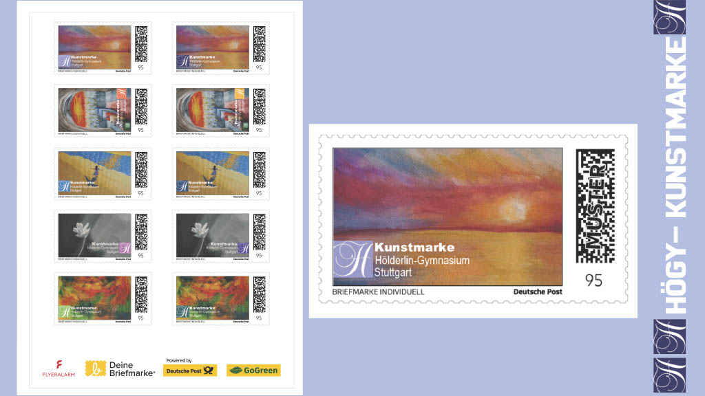 Vielen Dank für die tollen Einreichungen! Die preisgekrönten Arbeiten des Wettbewerbs sind auf der „Kunstmarke“ als Briefmarken bei den Kunstlehrerinnen zu erwerben. Sie können regulär mit der Deutschen Post verschickt werden. Viel Freude damit!