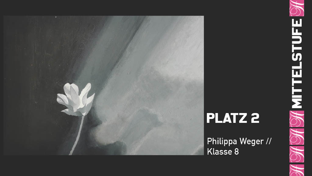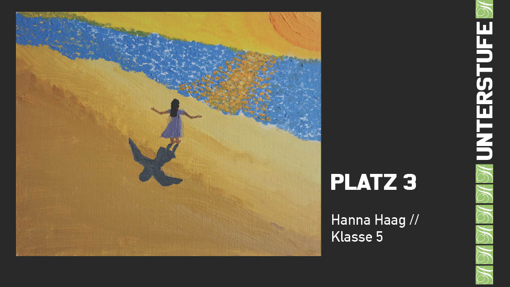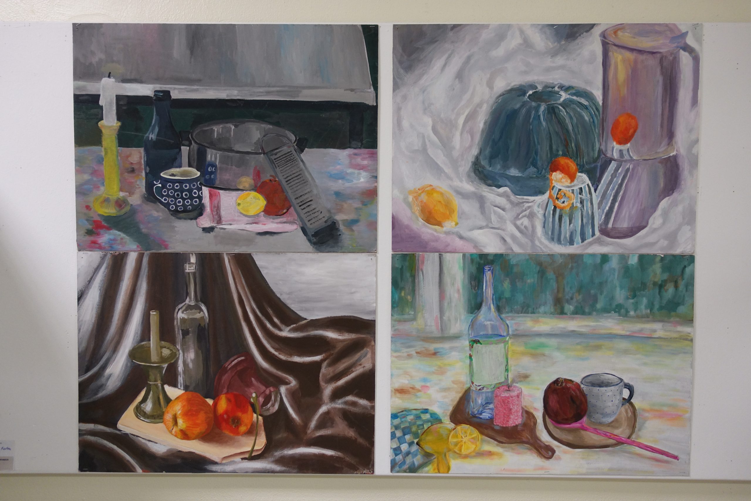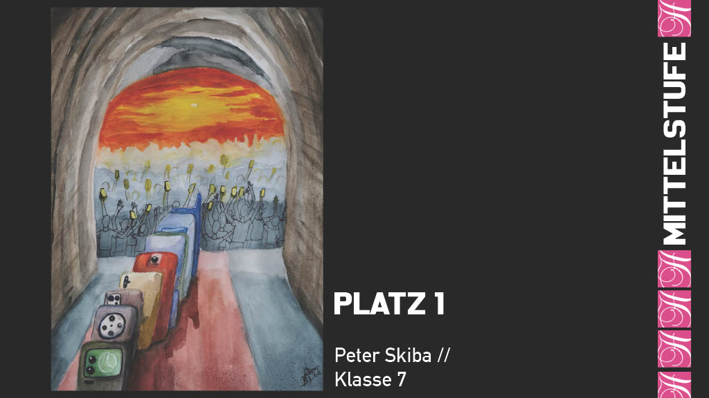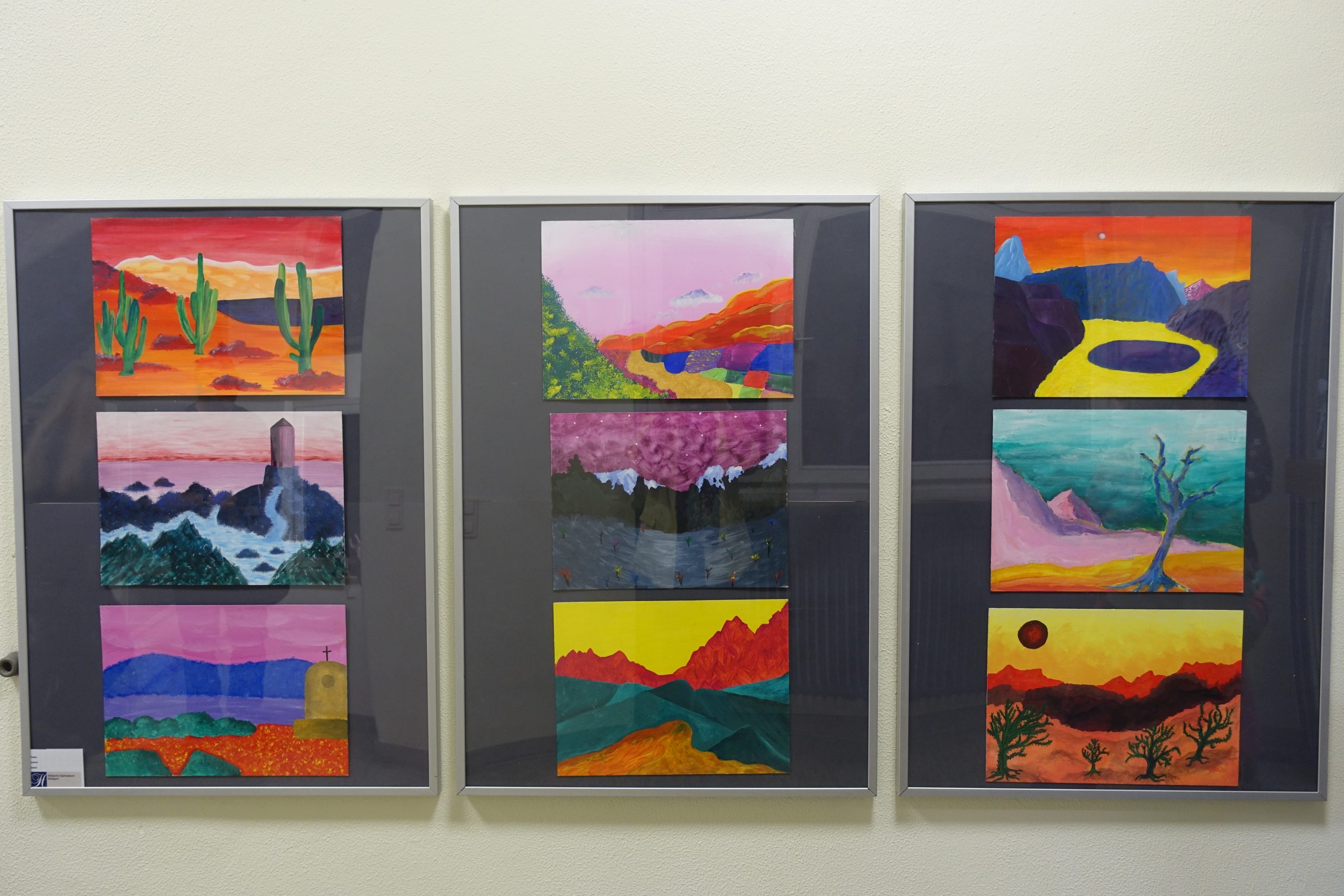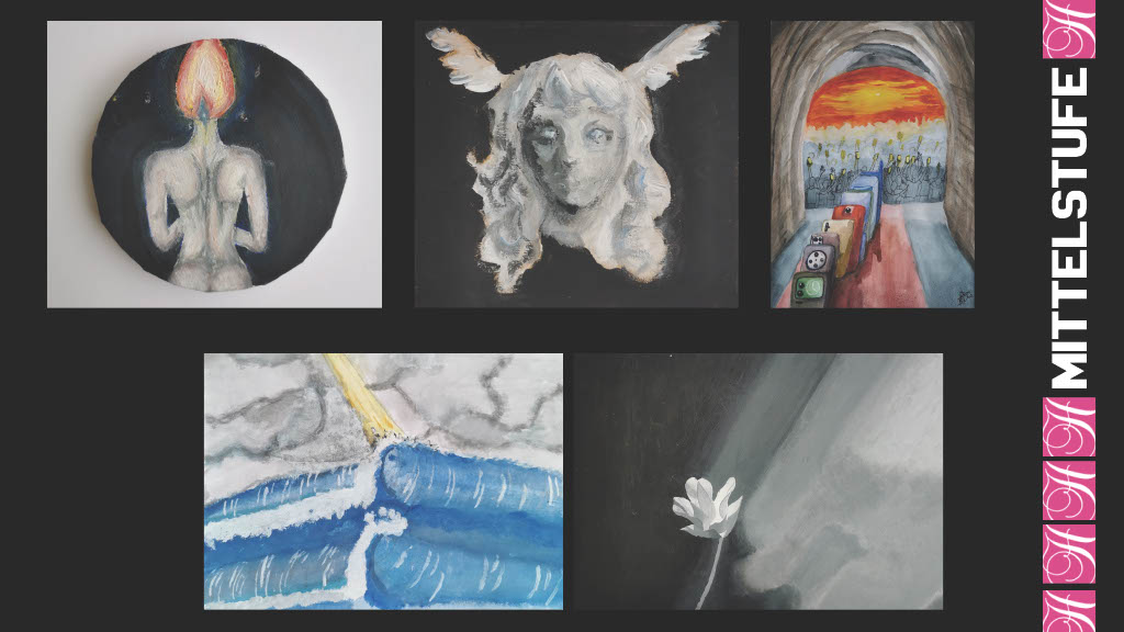 Das diesjährige Thema im Bereich der Malerei lautete: LICHT – erhellen, durchleuchten, durchfluten. Zahlreiche Malereien der Unter- und Mittelstufe wurden eingereicht und abends bei der Vernissage in einer flammenden Rede der KulturStarterinnen gekürt. In unterschiedlichster Weise gingen die Teilnehmenden mit dem Thema LICHT um. Szenen am Strand, in denen sich das Licht der Sonne geschickt auf den Wellen bricht, starke Hell-Dunkel Kontraste in grafischer Silhouttenführung eines Skifahrers vor dem blut-roten Morgenhimmel, abstrakte Umsetzung malerischer Flächen des brechenden Lichts und plastische Schwarz-Weiß-Malereien zeigten ein breites Spektrum in der Umsetzung dieses Themas. Ein grün leuchtendes Laserschwert Jodas und eine überlegte Bildkomposition zur Interpretation des gegenwär gen Medienkonsums überraschten im malerischen Umgang mit Farbe.