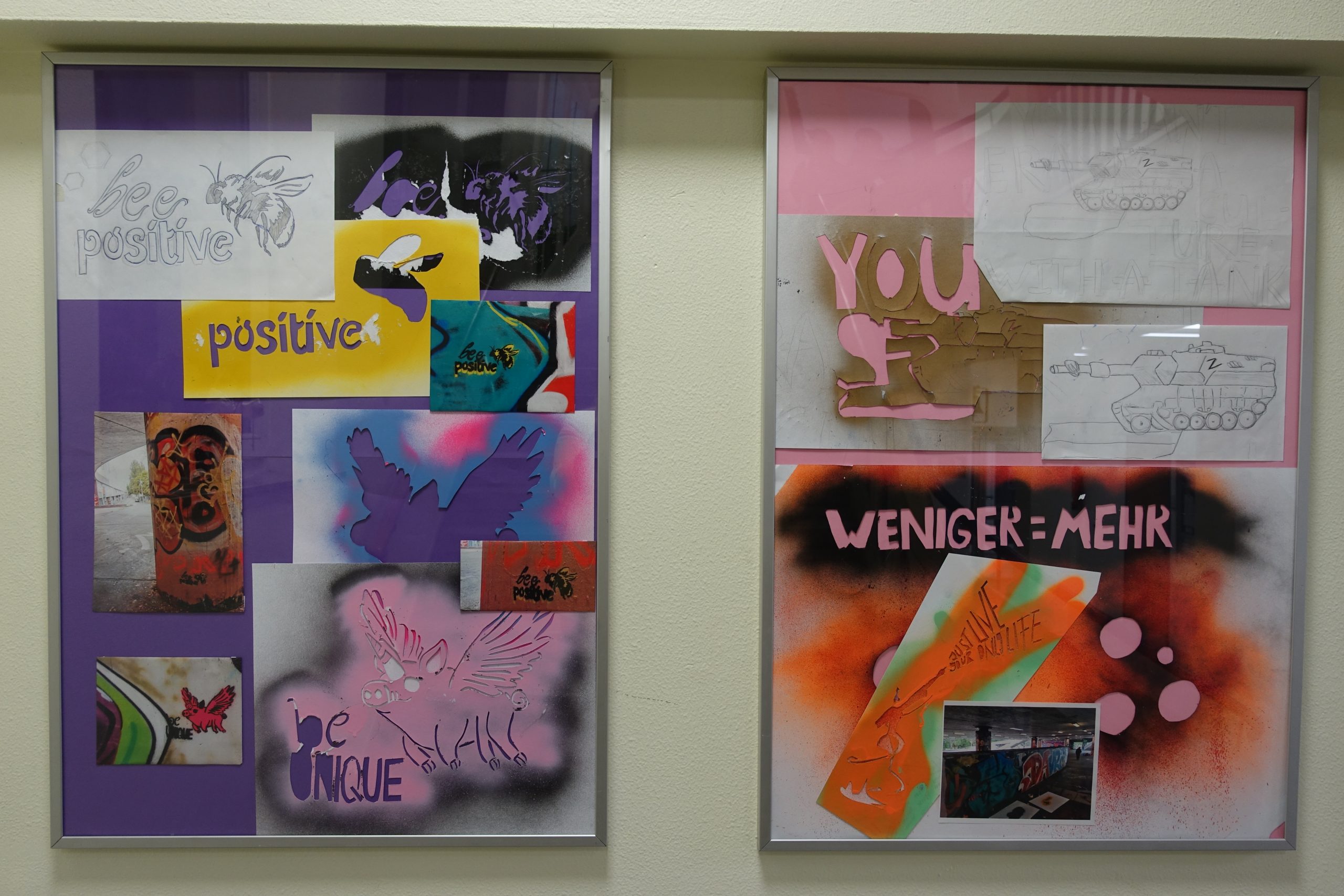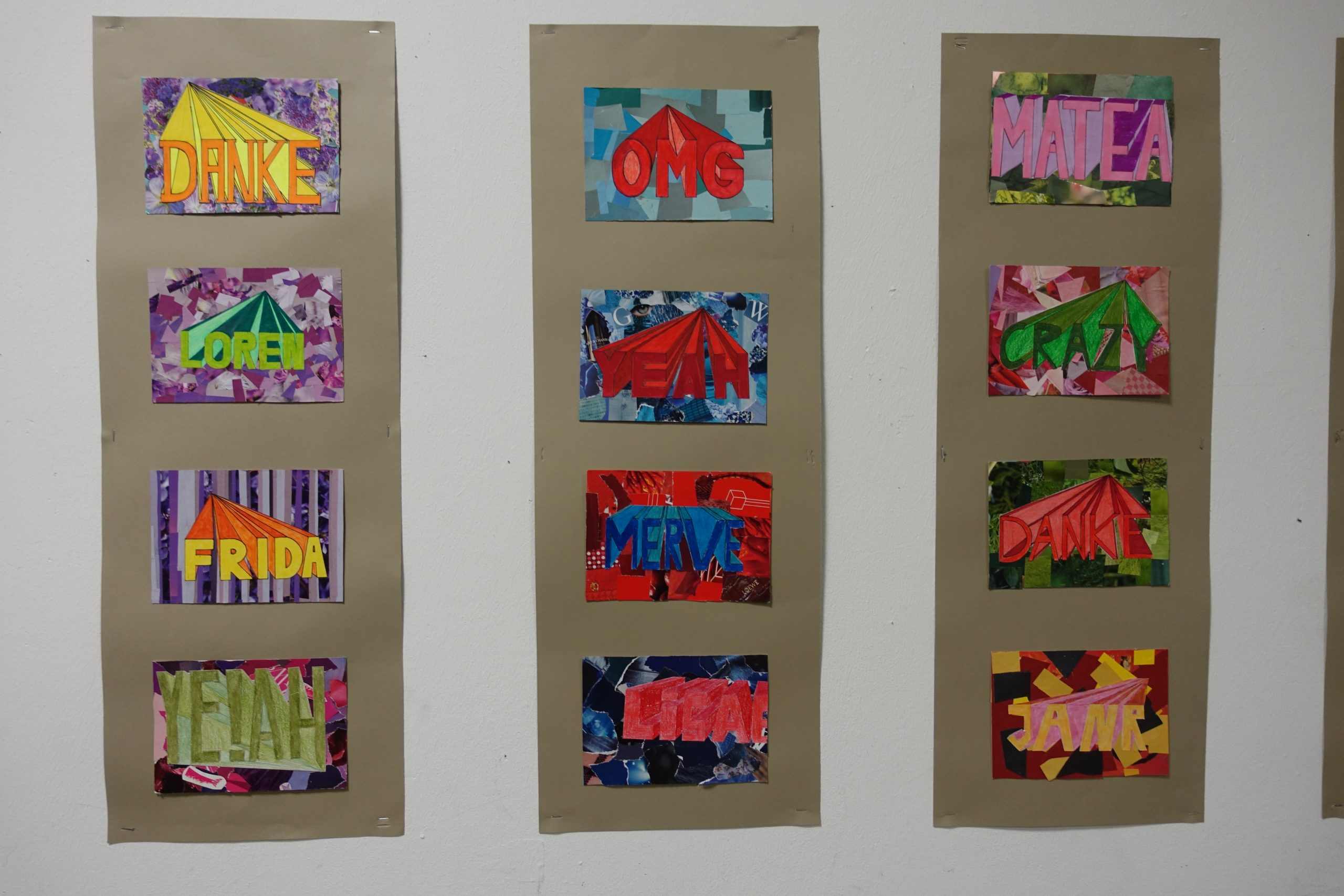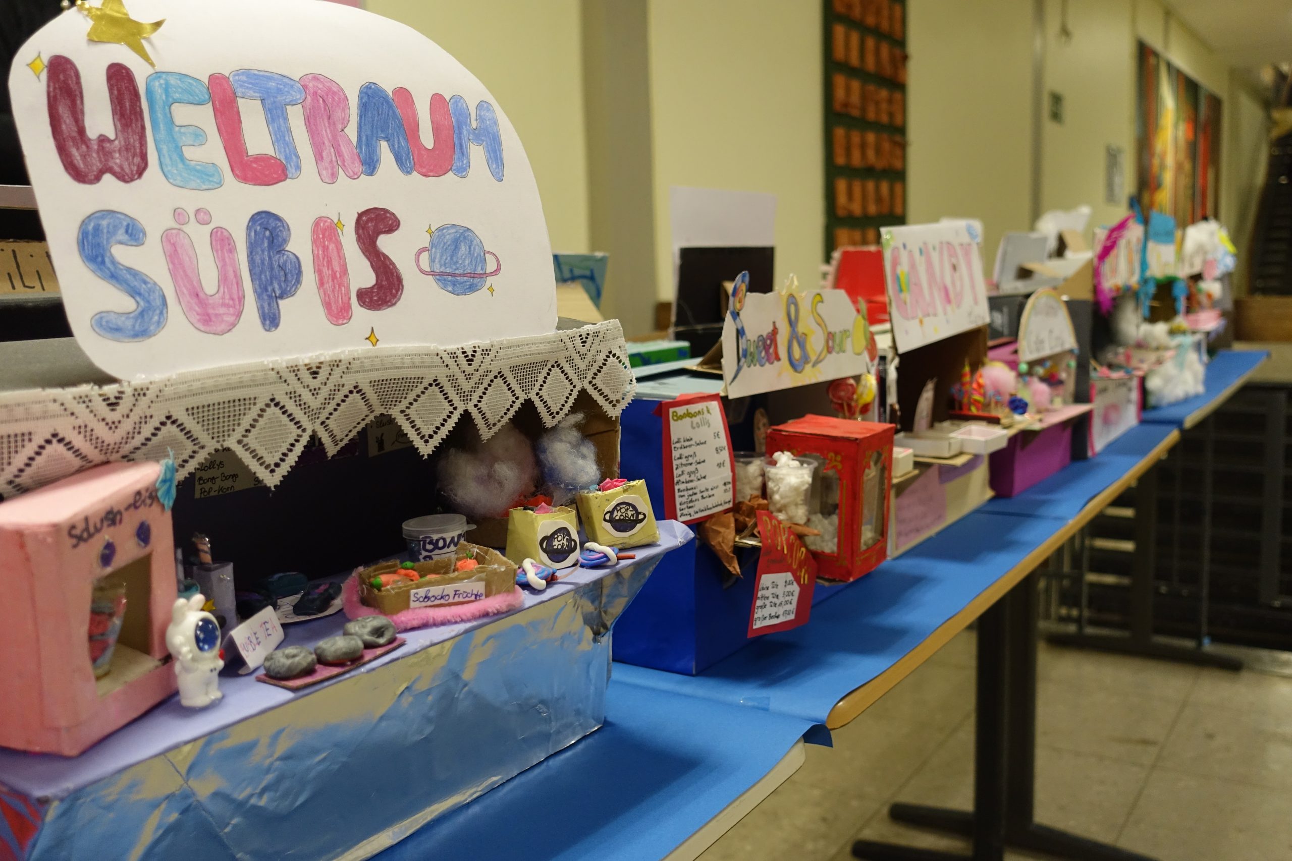 Der Jahrmarkt der Klasse 6 wurde bestaunt, liebevoll gefertigte Miniatur-Marktstände zeigen die Vielfalt einer bunten Kirmes: zuckrige Churros, Candyshops mit den ausgefallensten Süßigkeiten oder Entchen-Angeln, witzig und fein säuberlich angeordnet. Ein Stück weiter verraten Piratenkarten mit detailreichen Tuschezeichnungen den Besuchern den Weg zum Schatz im Meer. Kompliziert und mechanisch aufgebaute Farbautomaten zeigen die Mischtechnik der reinen Farben. Gehörnte Kuscheltiere, selbst genäht, lassen die Blicke der Besuchenden nach oben wandern. Da baumeln sie und scheinen grinsend nach unten zu schielen. Exakte Bewegungszeichnungen aus Graphit, lustige Tonfiguren, Graffitiaufnahmen aus der Hall of Fame, komplexe Architekturmodelle mit ihren Plänen, Objekte aus dem Produktdesign, Drucke und Werwolf-Spielkarten…es gibt so viel zu entdecken…