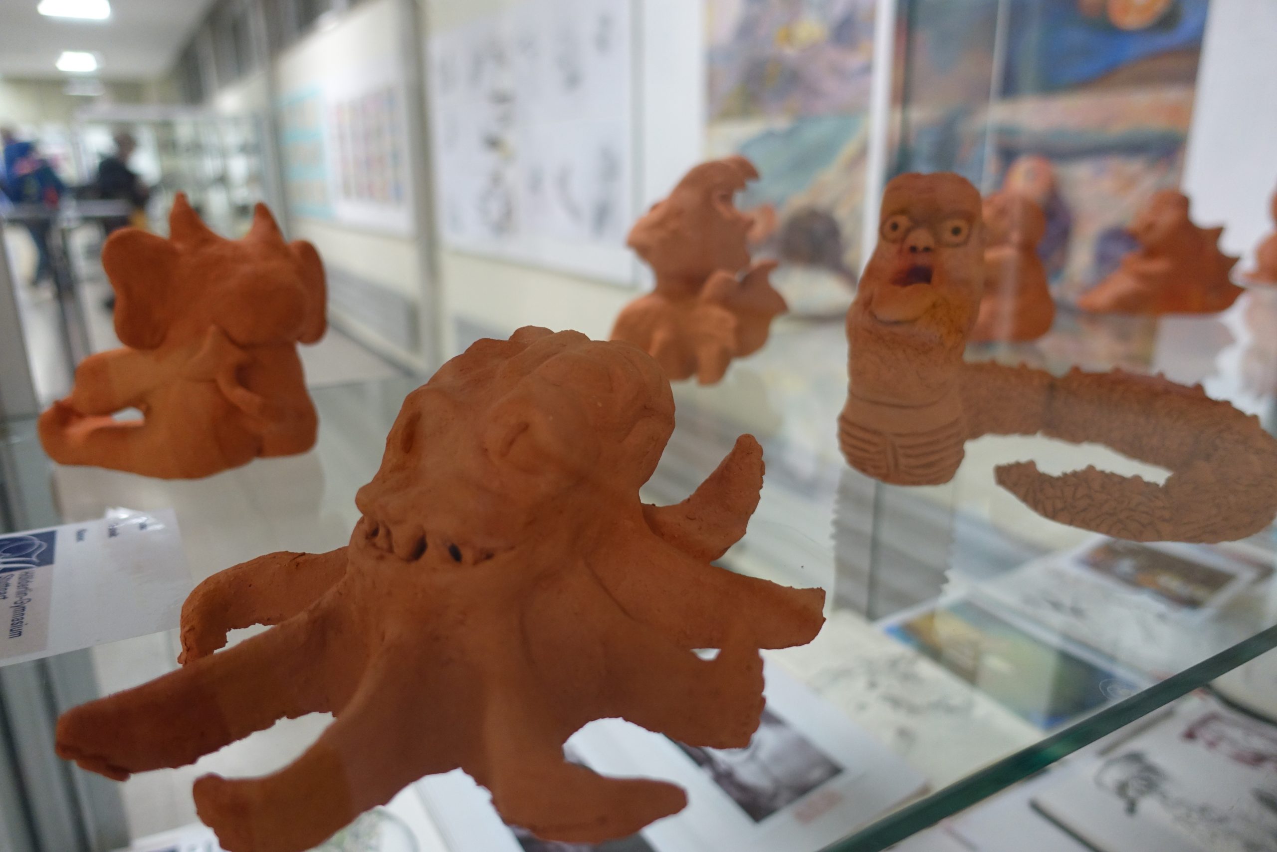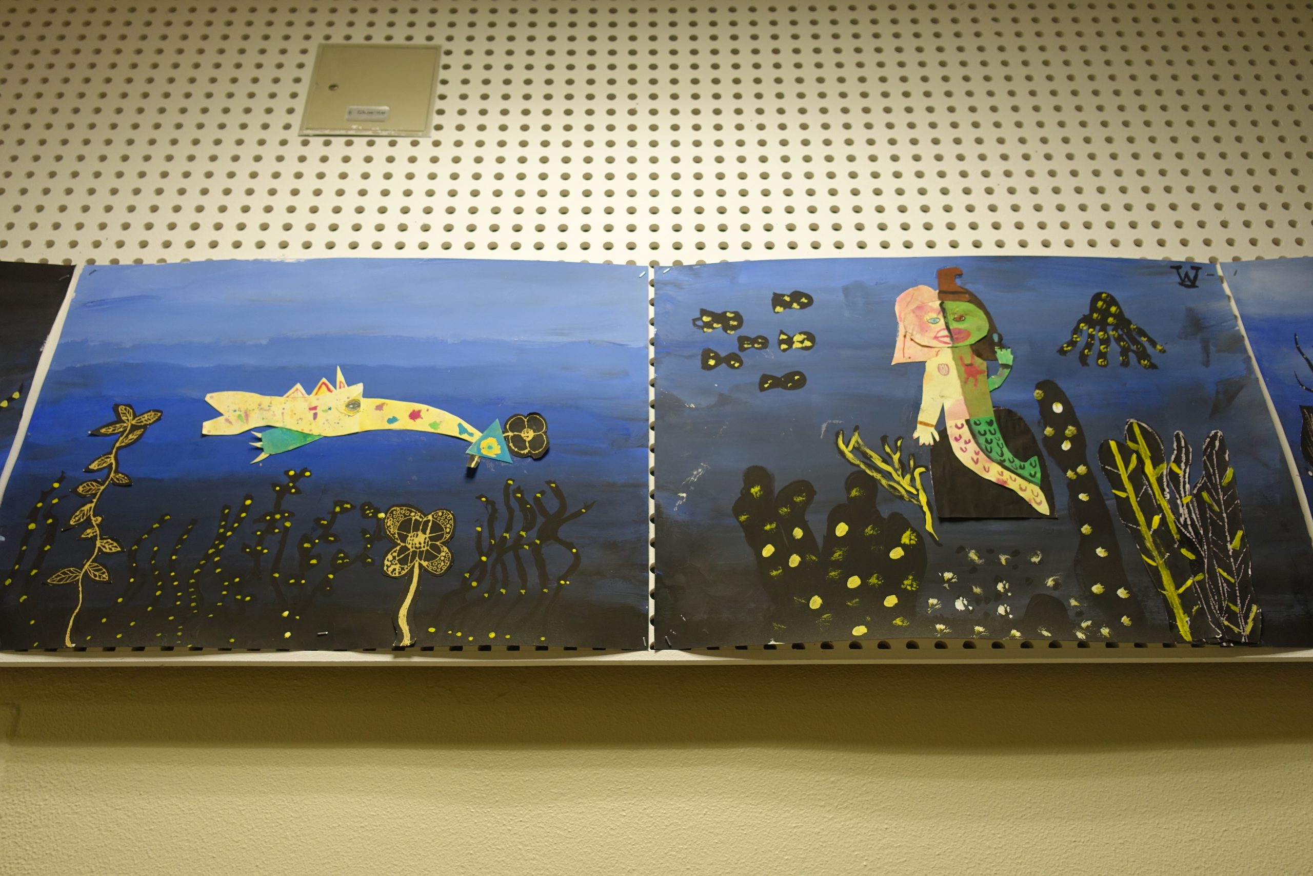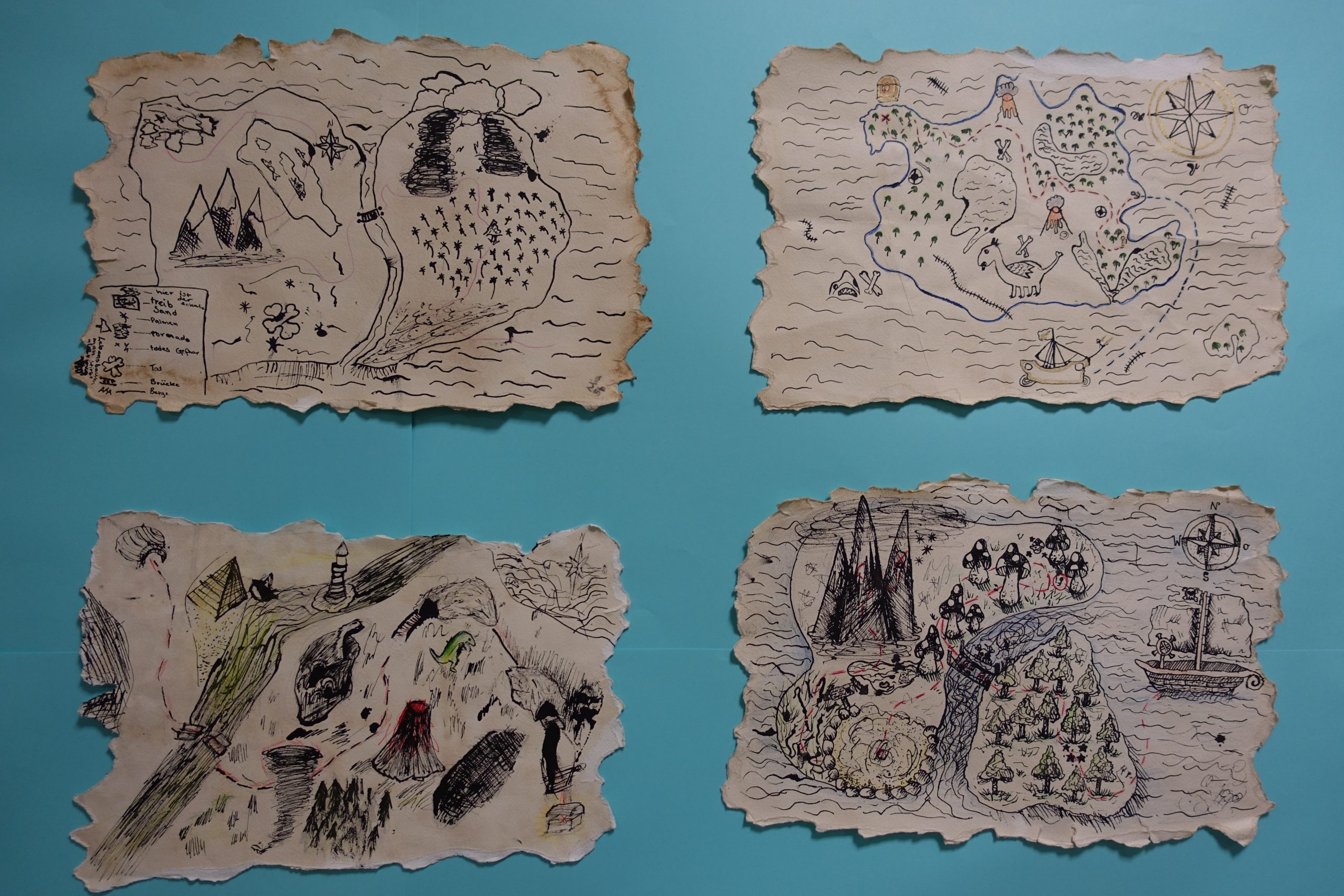 Der Jahrmarkt der Klasse 6 wurde bestaunt, liebevoll gefertigte Miniatur-Marktstände zeigen die Vielfalt einer bunten Kirmes: zuckrige Churros, Candyshops mit den ausgefallensten Süßigkeiten oder Entchen-Angeln, witzig und fein säuberlich angeordnet. Ein Stück weiter verraten Piratenkarten mit detailreichen Tuschezeichnungen den Besuchern den Weg zum Schatz im Meer. Kompliziert und mechanisch aufgebaute Farbautomaten zeigen die Mischtechnik der reinen Farben. Gehörnte Kuscheltiere, selbst genäht, lassen die Blicke der Besuchenden nach oben wandern. Da baumeln sie und scheinen grinsend nach unten zu schielen. Exakte Bewegungszeichnungen aus Graphit, lustige Tonfiguren, Graffitiaufnahmen aus der Hall of Fame, komplexe Architekturmodelle mit ihren Plänen, Objekte aus dem Produktdesign, Drucke und Werwolf-Spielkarten…es gibt so viel zu entdecken…