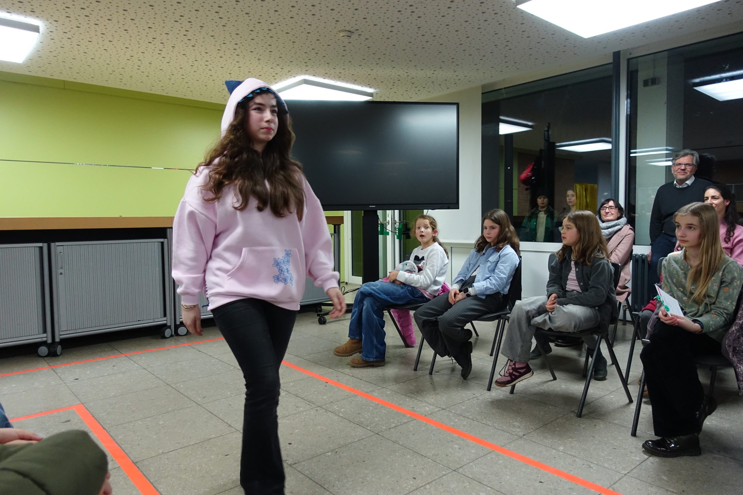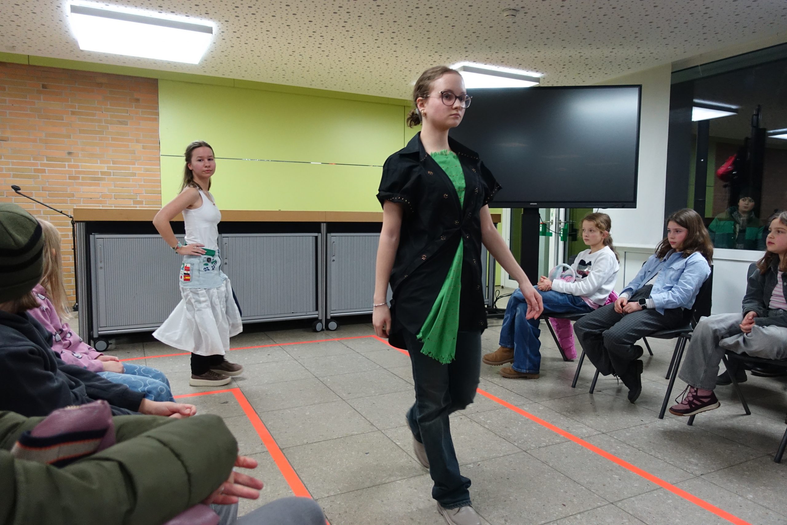Die Profilklasse 9 stellte uns bei ihrer Fashionshow ihre Kleidungsstücke vor, die sie im Bereich Modedesign im Unterricht hergestellt haben. Sie recherchierten zu der Reise ihres Kleidungsstück von der Herkunft der Rohstoffe, über den Sitz ihres Labels, Produktion, Färberei und Näherei und sammelten Informationen zu den Stationen in der Produktionskette. In der Auseinandersetzung mit Fast Fashion eröffneten sich Fragen zu Greenwashing und erschreckenden Arbeitsbedingungen in der Herstellung. Studierende der Kunstakademie Stuttgart erzählten von ihrer Aktion mit der Aktivistengruppe „yes men“, die bei der Berliner Fashion Week die Zustände in der Modebranche durch eine fake Kollektion von Adidas störten.