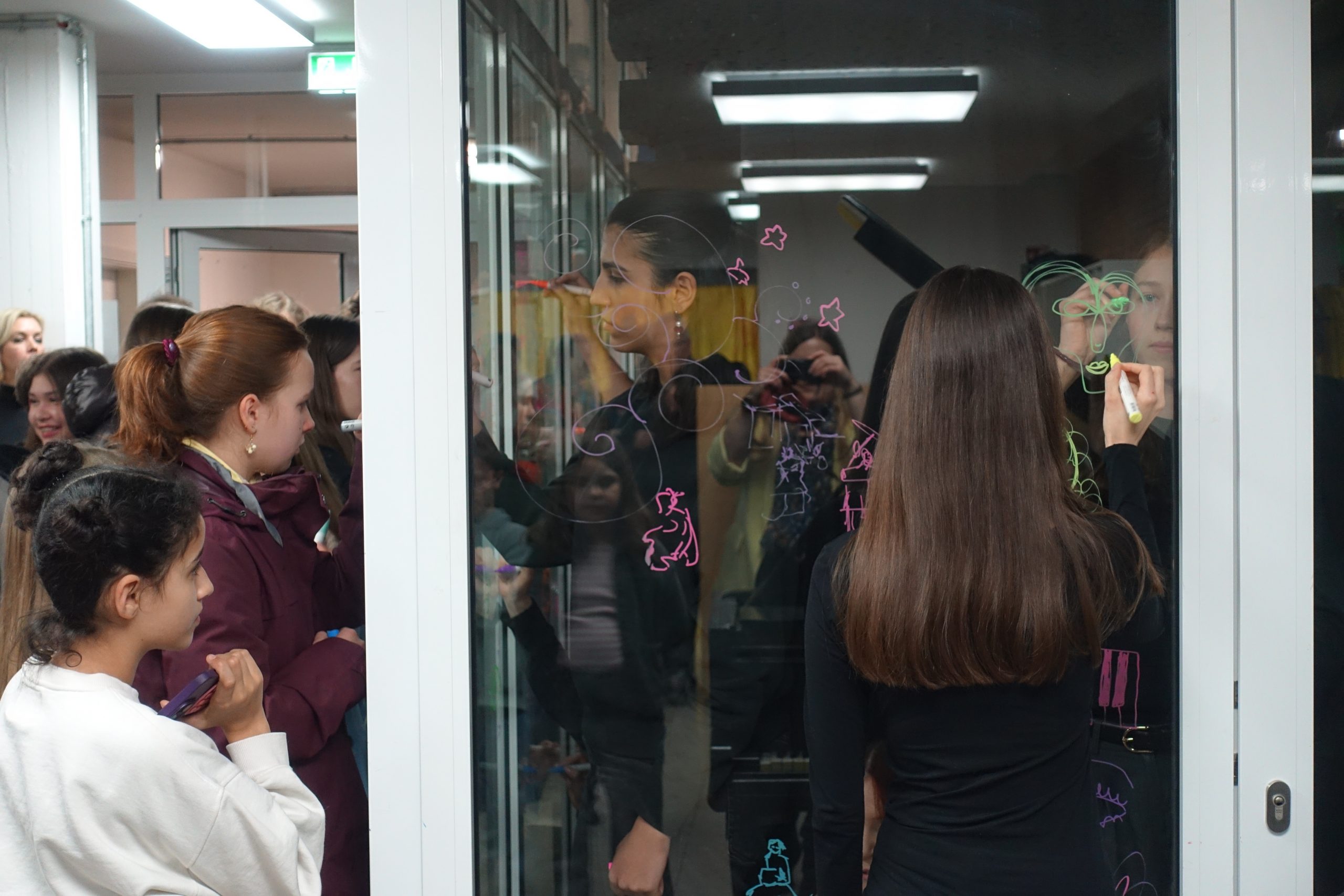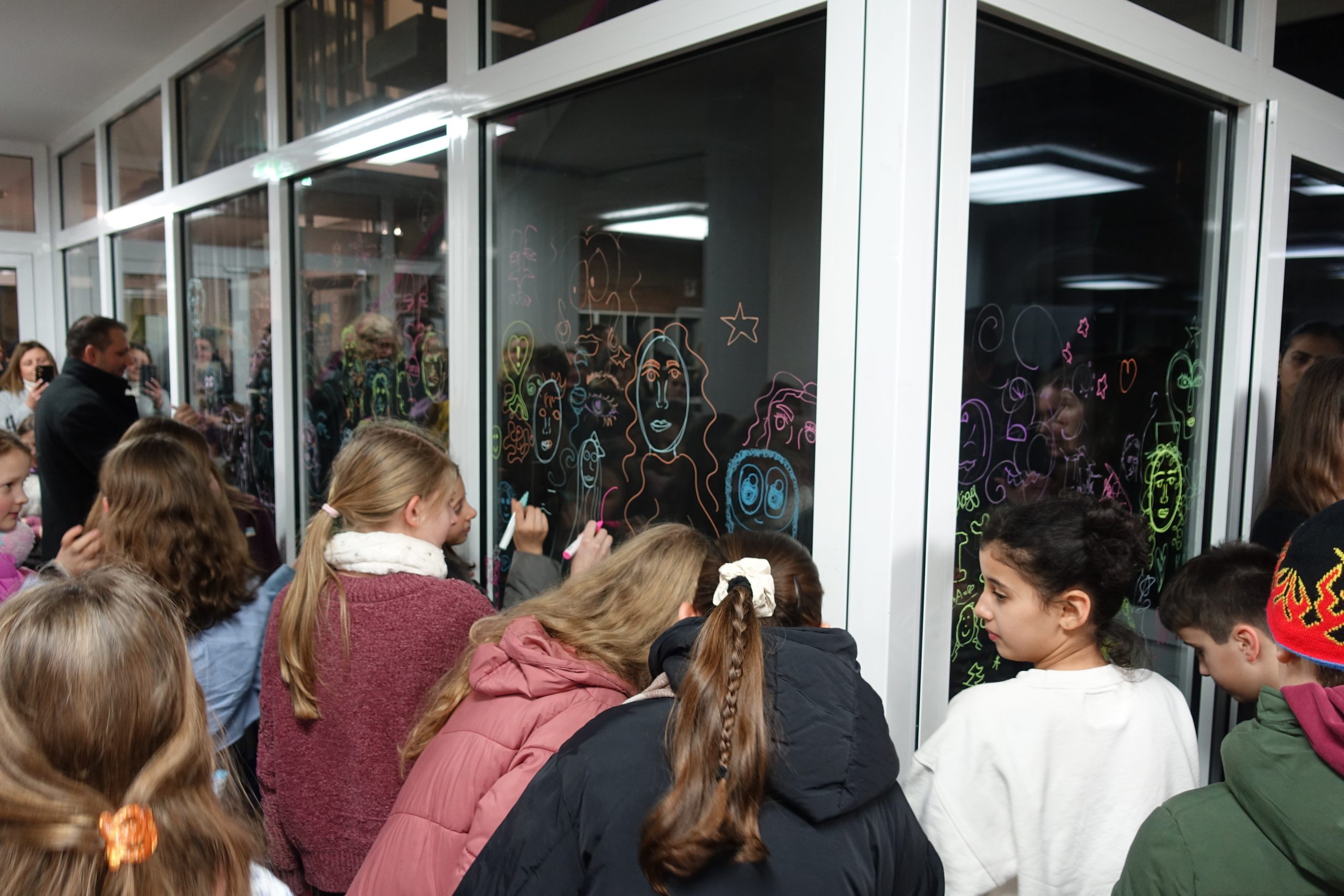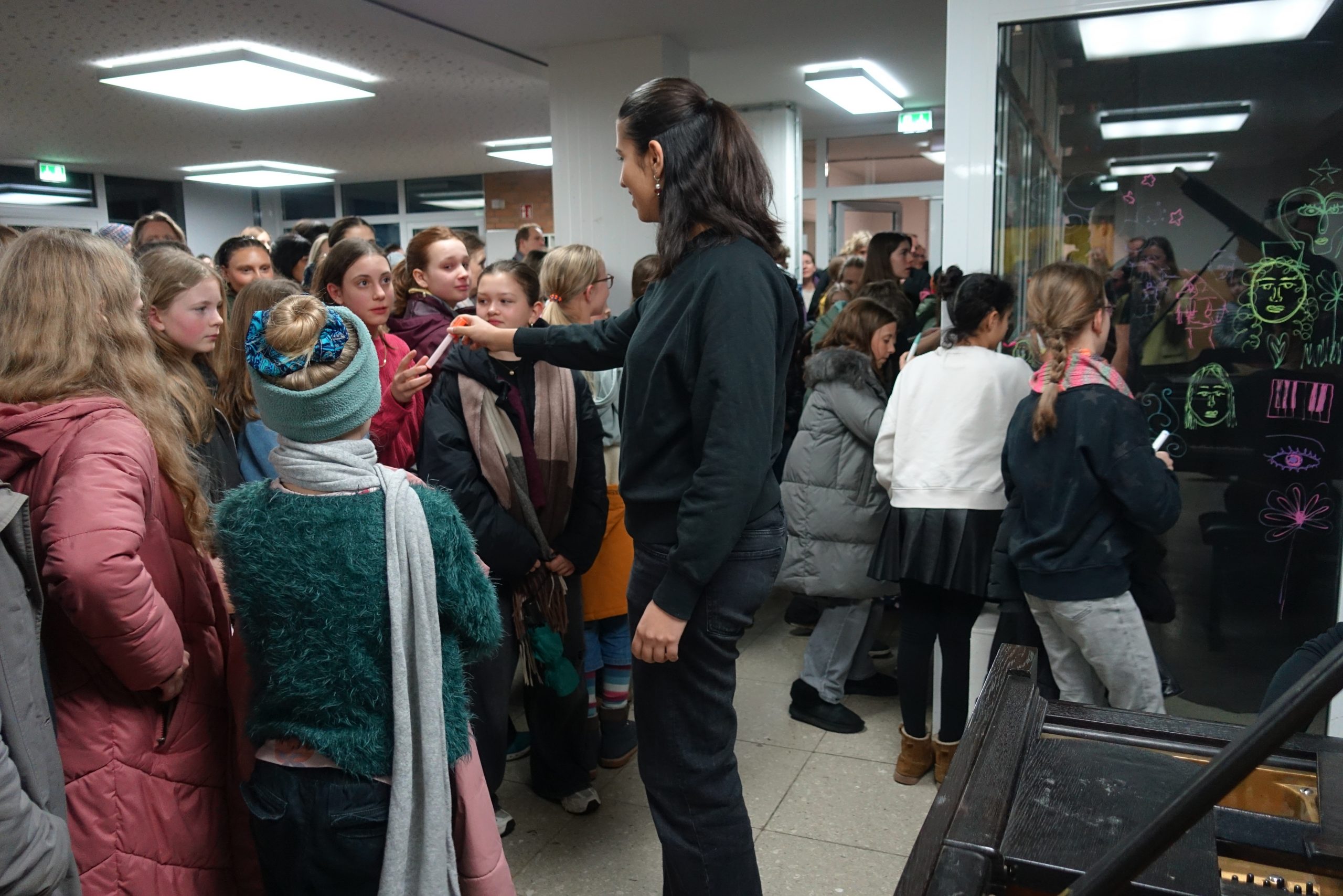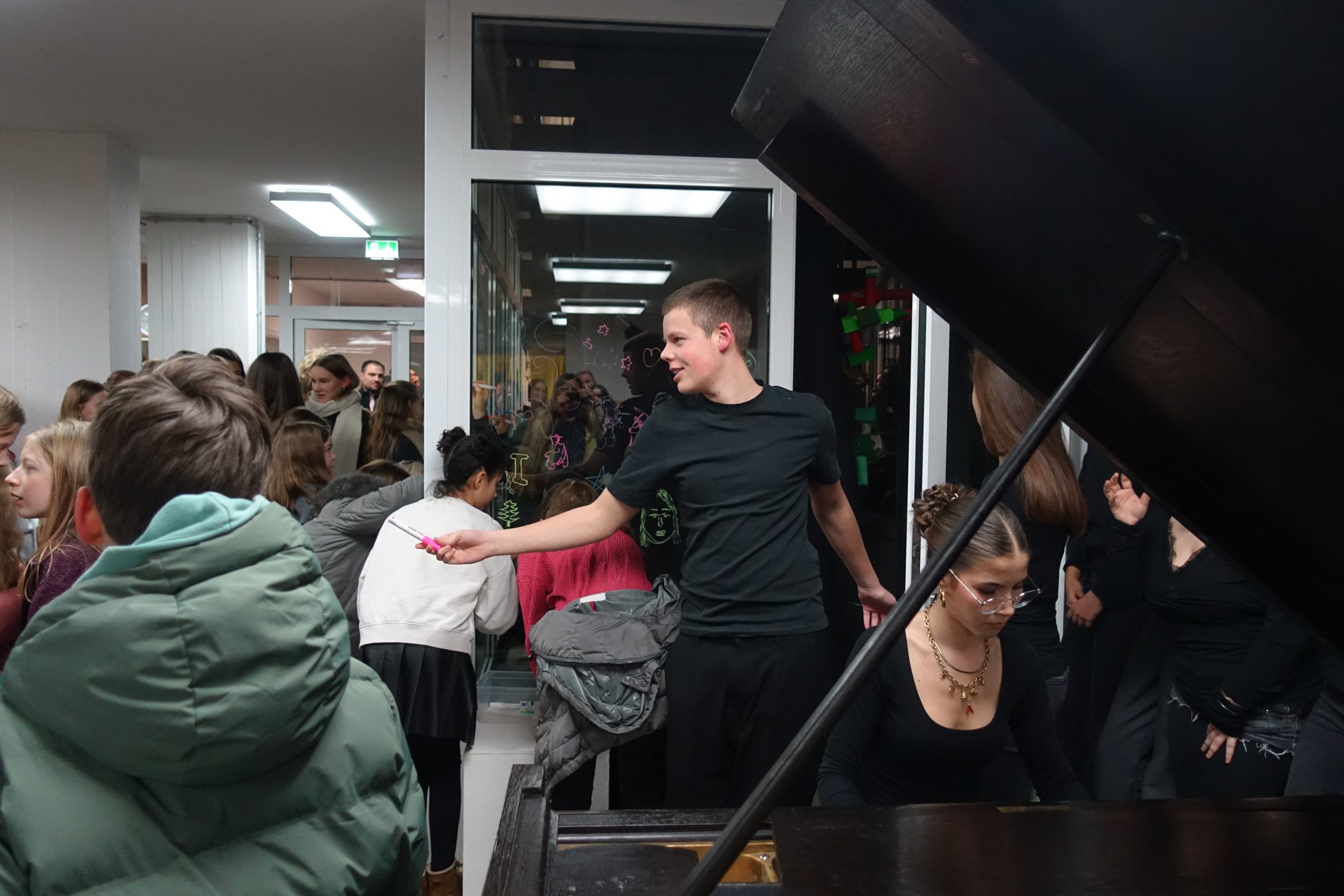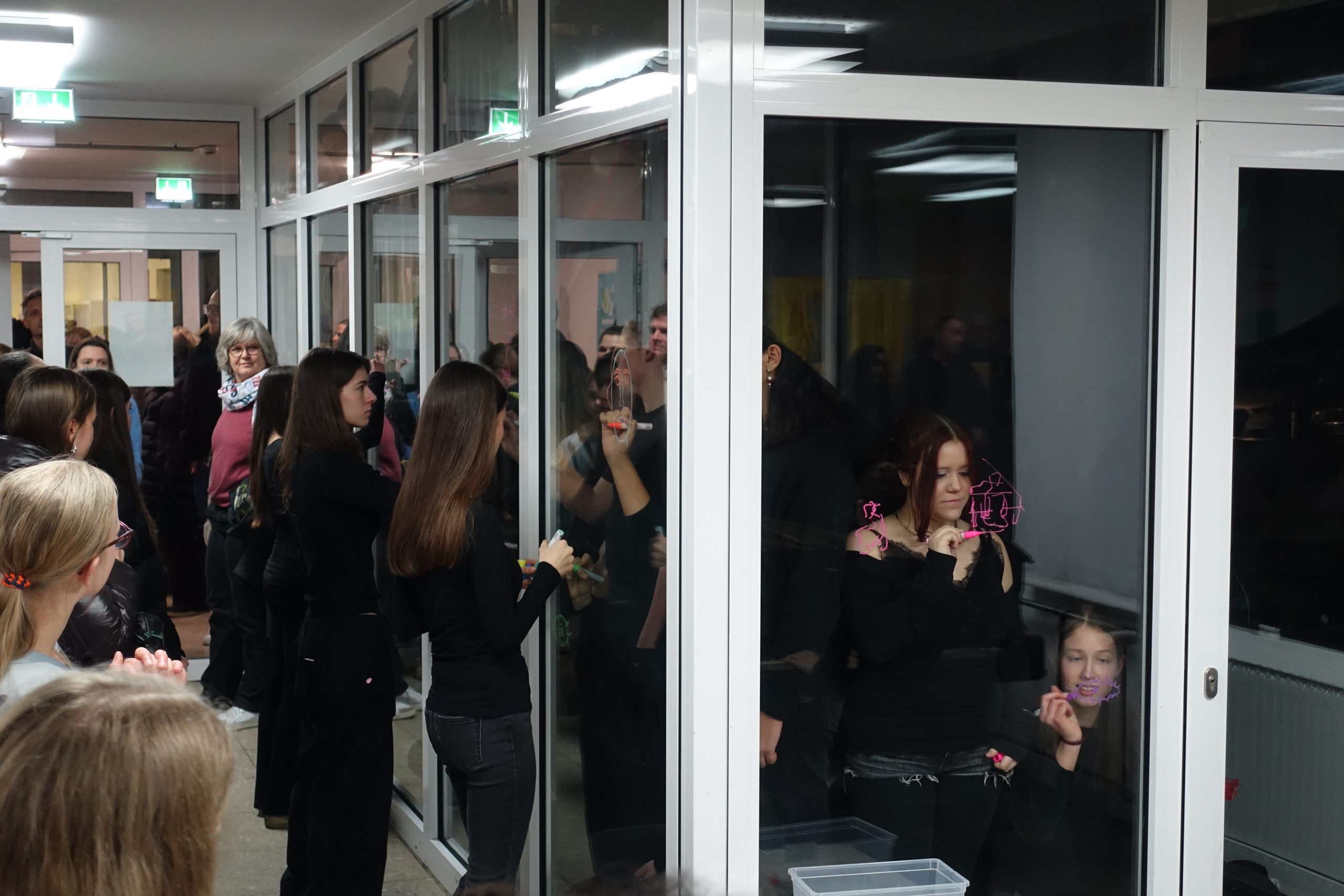 Nachdem die Models den Laufsteg verlassen haben, schloss sich eine leisere, fast intime Darbietung des Leistungsfachs Kunst der Jahrgangsstufe 1 an. Zu zauberhaften, tropfenartigen Klängen am Flügel zeigte der Kurs in ihrer Performance eine zeichnerische Begegnung mit den Besuchern der Vernissage. Schülerinnen und Schüler im Glaskasten trafen auf Mitschüler außerhalb des Glases. Nur durch die dünne Scheibe getrennt, fertigten sie schnelle, zarte Zeichnungen ihres Gegenübers an. Leicht, fast träumerisch begegneten sie sich, erweiterten grafisch ihre jeweiligen Sichtweisen. Der Stift wurde an die umstehenden Besucher weiter gereicht. Kollaborativ entstand in farbigen, sich überlagernden Skizzen ein eindrucksvolles Gesamtbild von Innen und Außen und wechselnden Perspektiven. Vielen Dank für die wunderbare Performance!