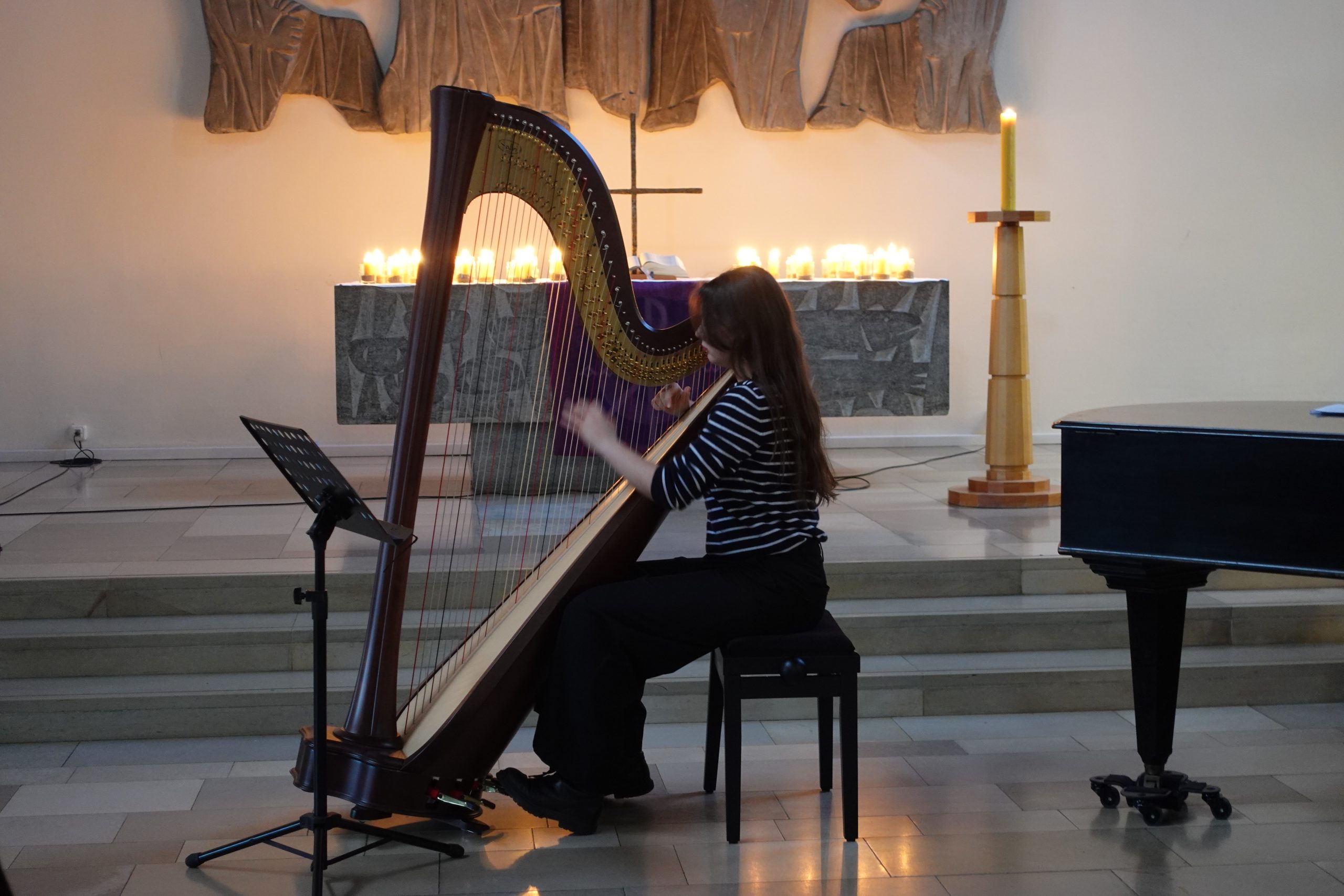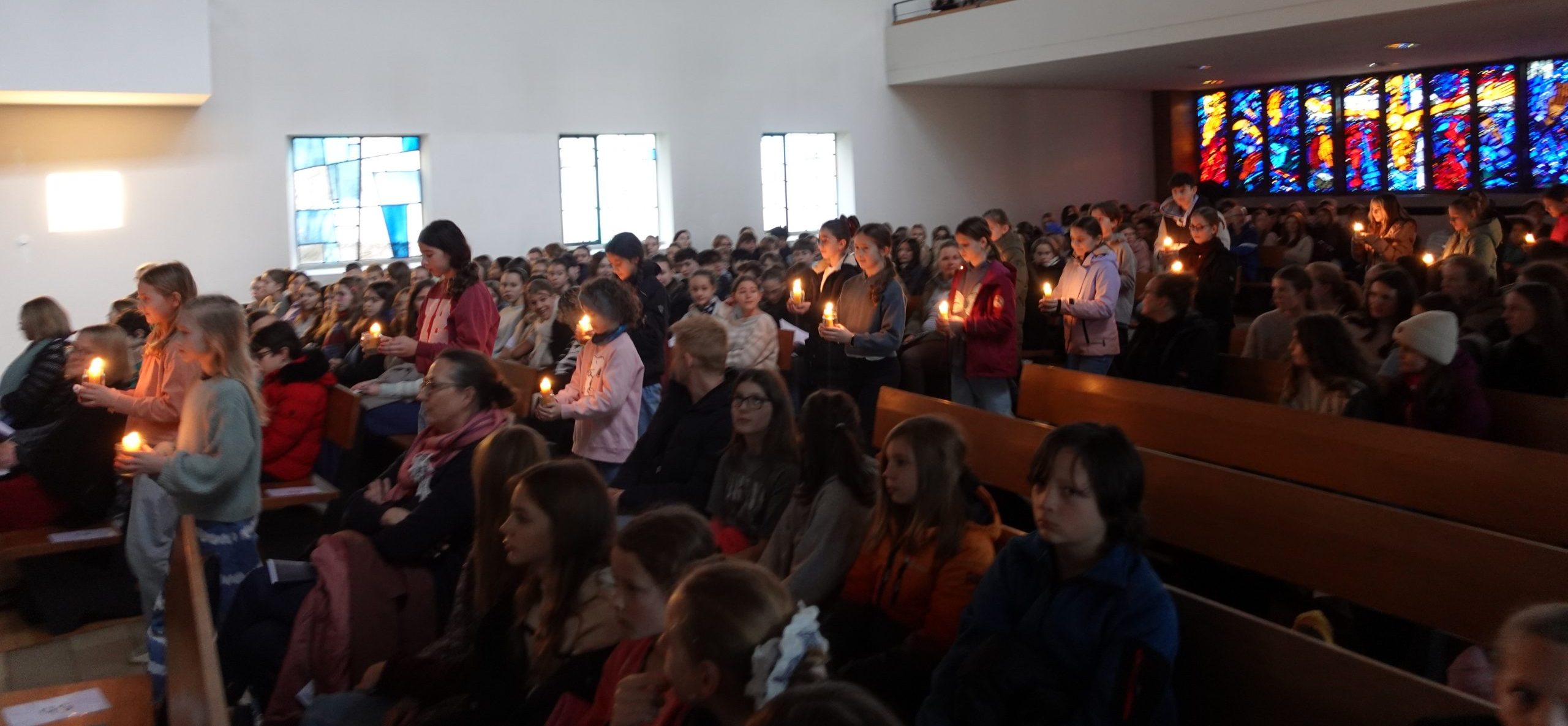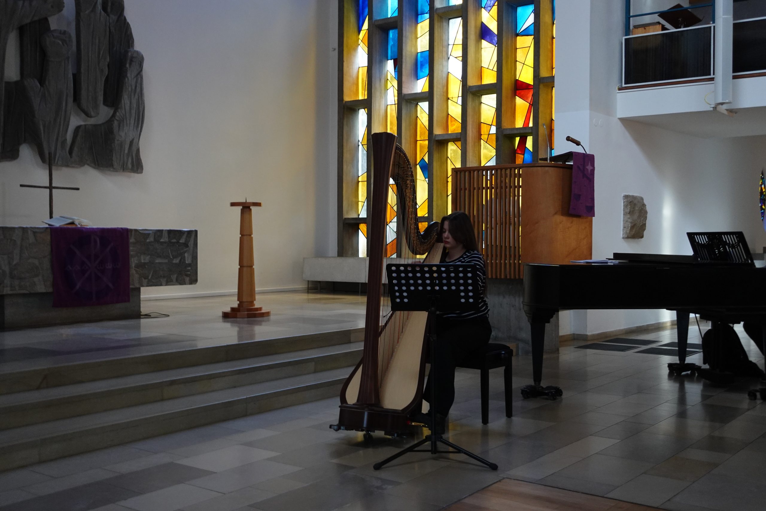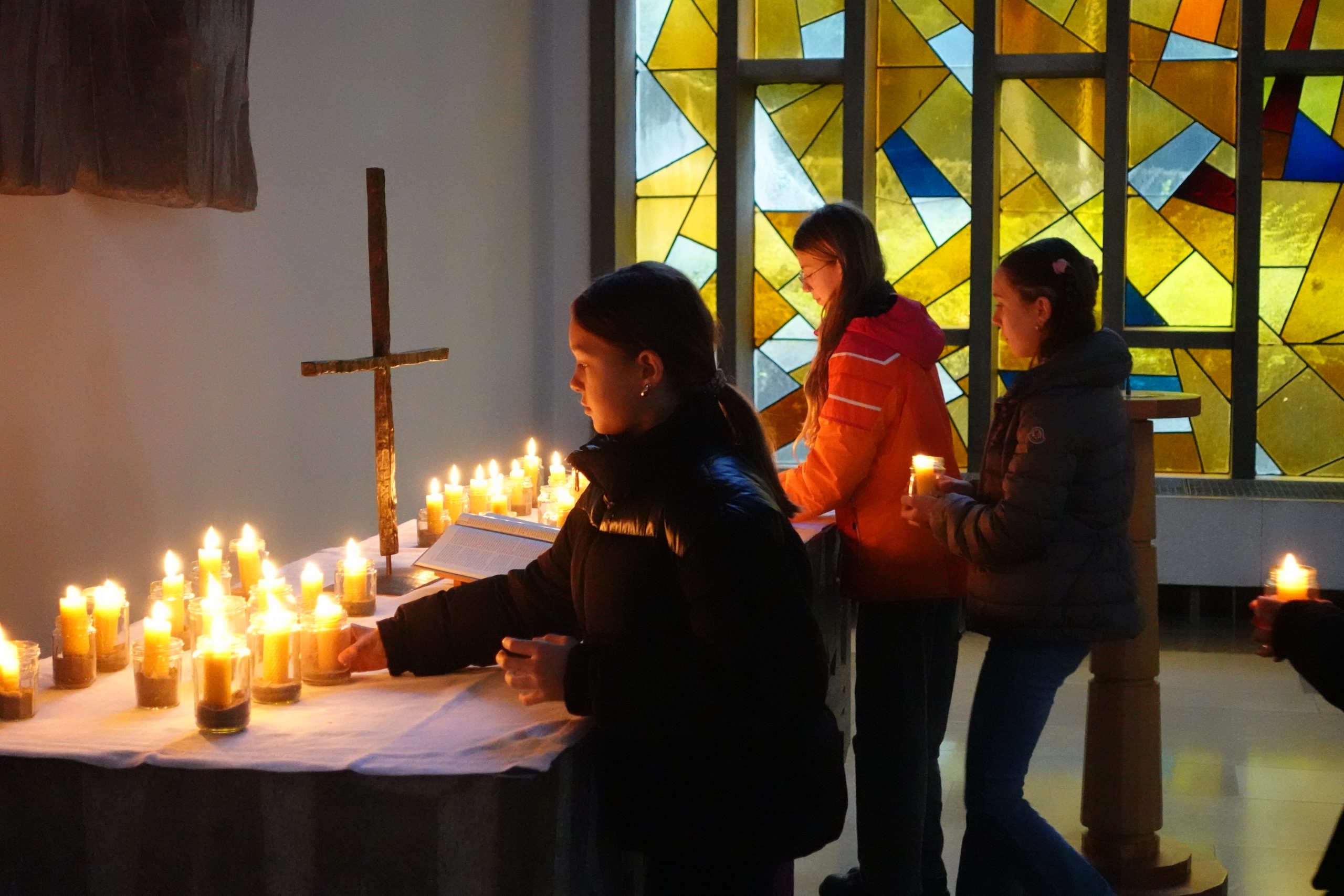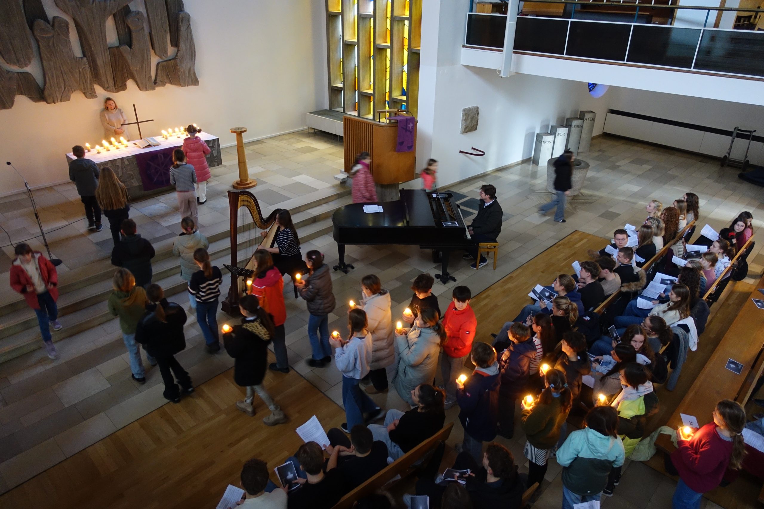 Dieses Jahr startete der Schulgottesdienst so, wie es das Thema „Besinnung“ vermuten ließ – ganz besinnlich. An der Harfe spielte Mia Mailänder eine wunderschöne Melodie, das Licht in der Kirche war gedimmt, es herrschte totale Stille und dann zog mit Schüler/-innen der Klassen 5 sprichwörtlich das Licht ein. Langsam trugen sie Kerzen aus Bienenwachs, gespendet von einem Opa, der Imker ist, nach vorne und platzierten sie auf dem Altar..