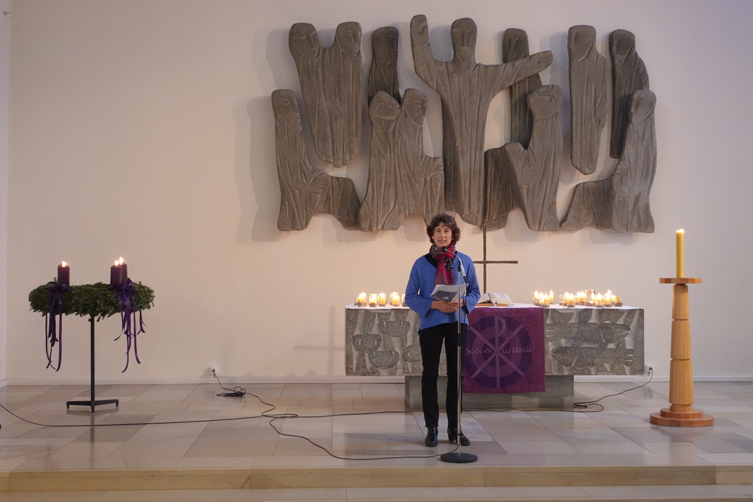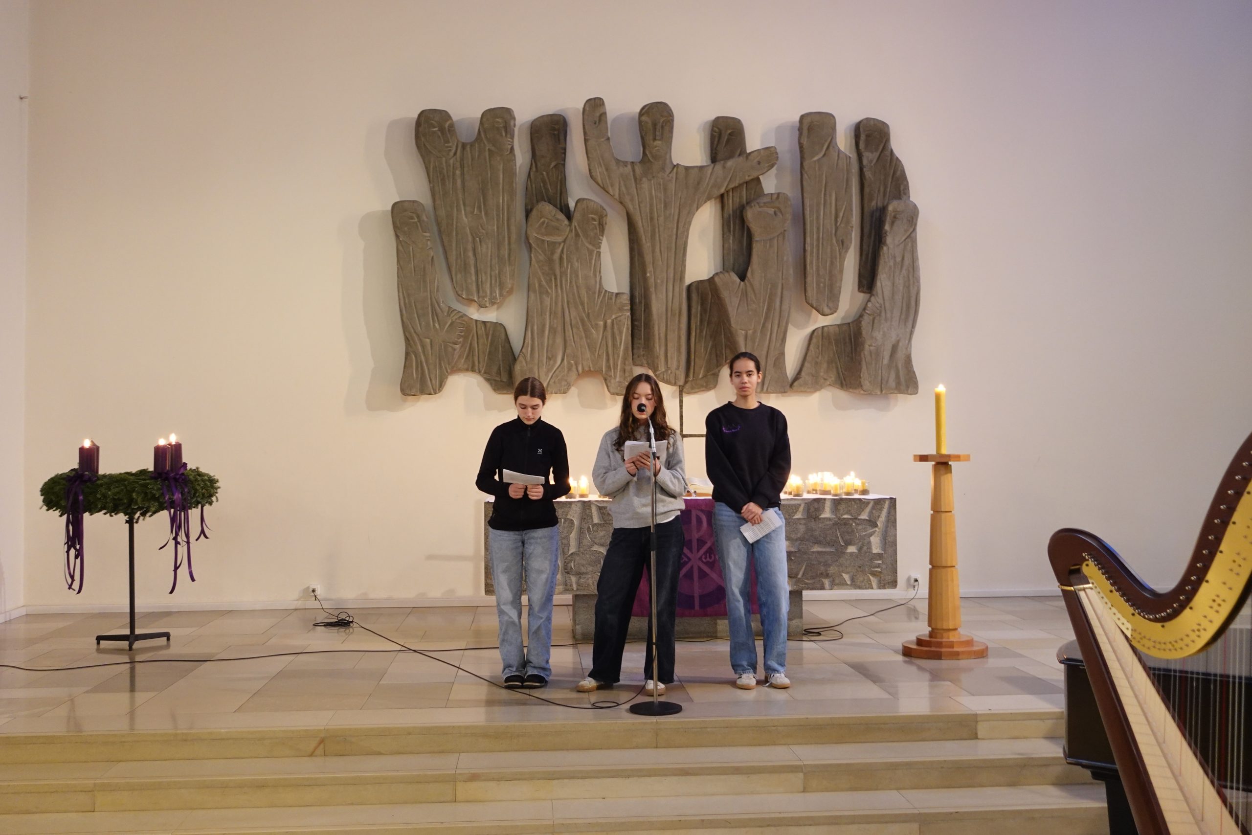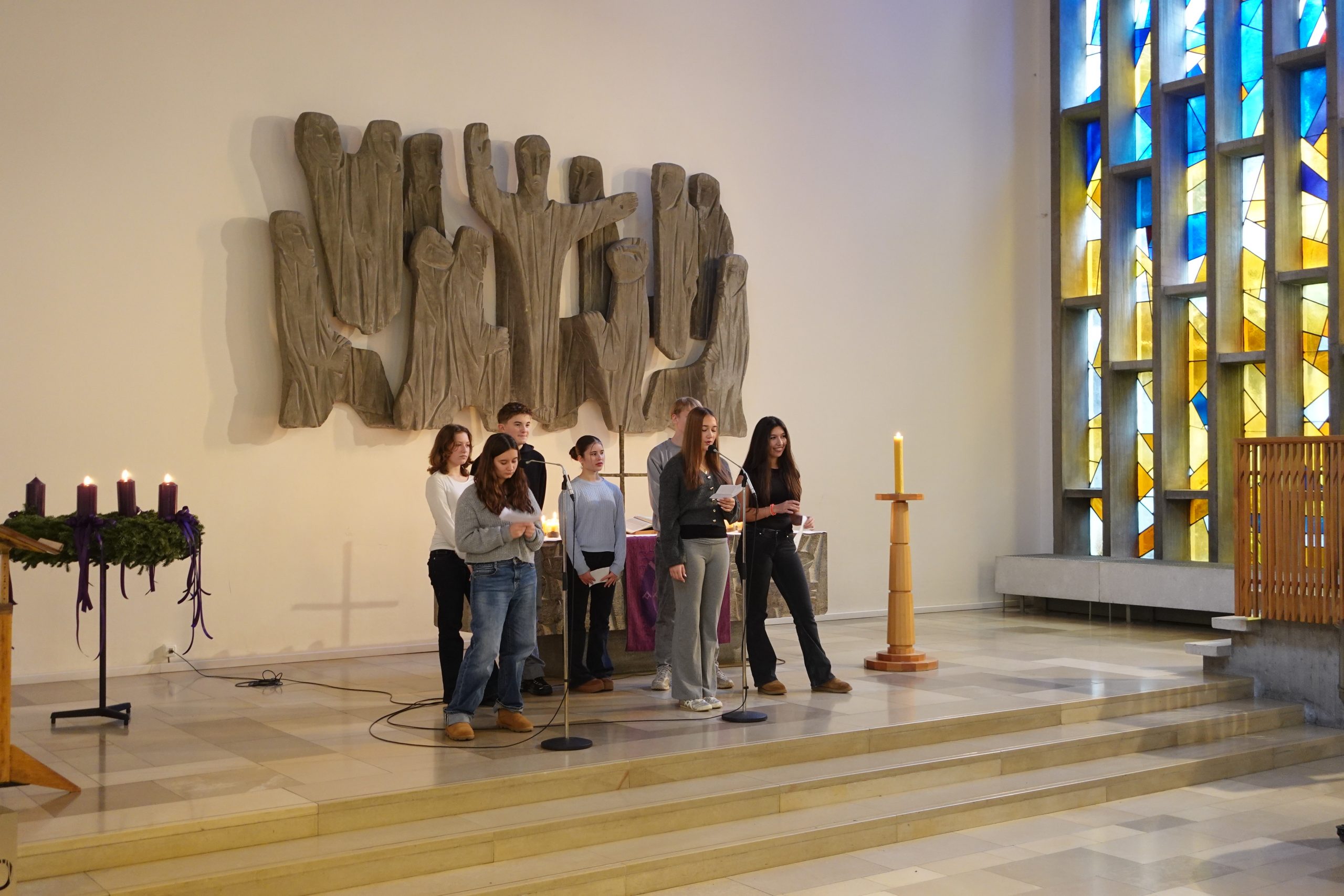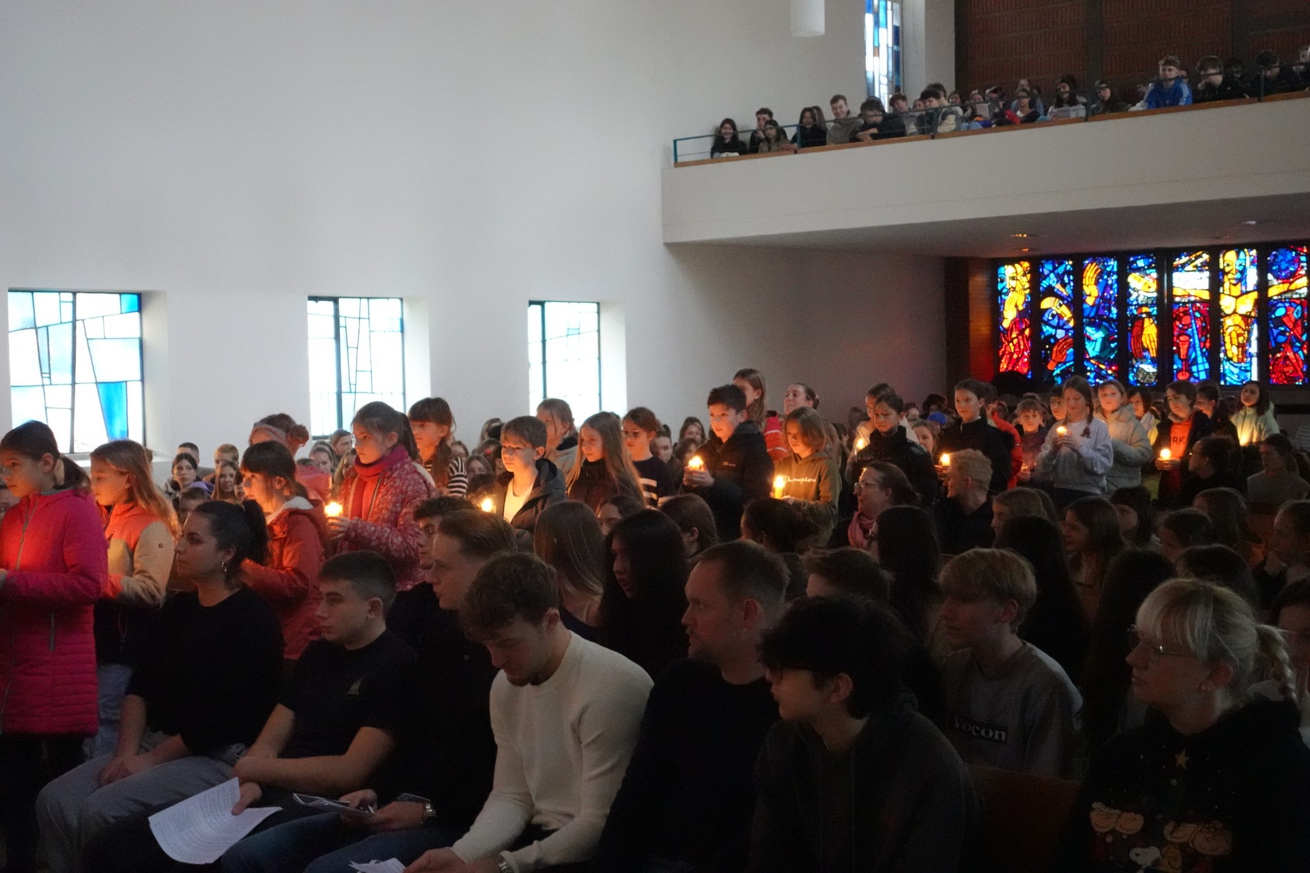 Nach einem gemeinsamen Lied, der Lesung der Weihnachtsgeschichte aus Lukas 2 und den Fürbitten der Klasse 9, folgte das Vater Unser, dieses vorgetragen in den verschiedensten Sprachen. „Wir sind eine große und bunte Gemeinschaft und wir gehören alle zusammen, das wollen wir damit zeigen“, erklärte Herr Bier, bevor Schüler/-innen auf deutsch, spanisch, französisch, englisch, aber auch kroatisch, ungarisch, ukrainisch, rumänisch und griechisch zu beten begannen.